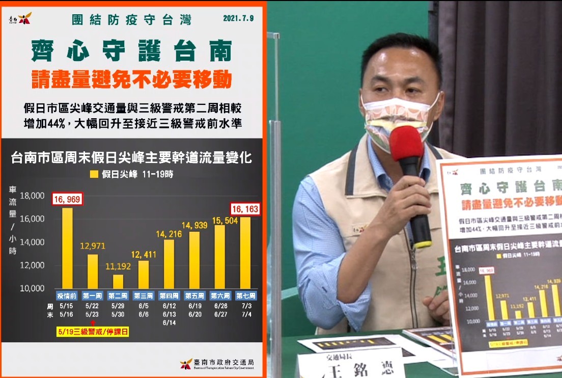 台南市交通局長王銘德指出,目前三級警戒已邁入第8周,從三級警戒第1周起,交通局便針對假日市區尖峰交通量進行監控,發現三級警戒一段時間後,民眾「確實是關不住」,比起疫情爆發後車流量最低的第二周,車流量增加了44%,大幅回升到接近三級警戒前的水準。