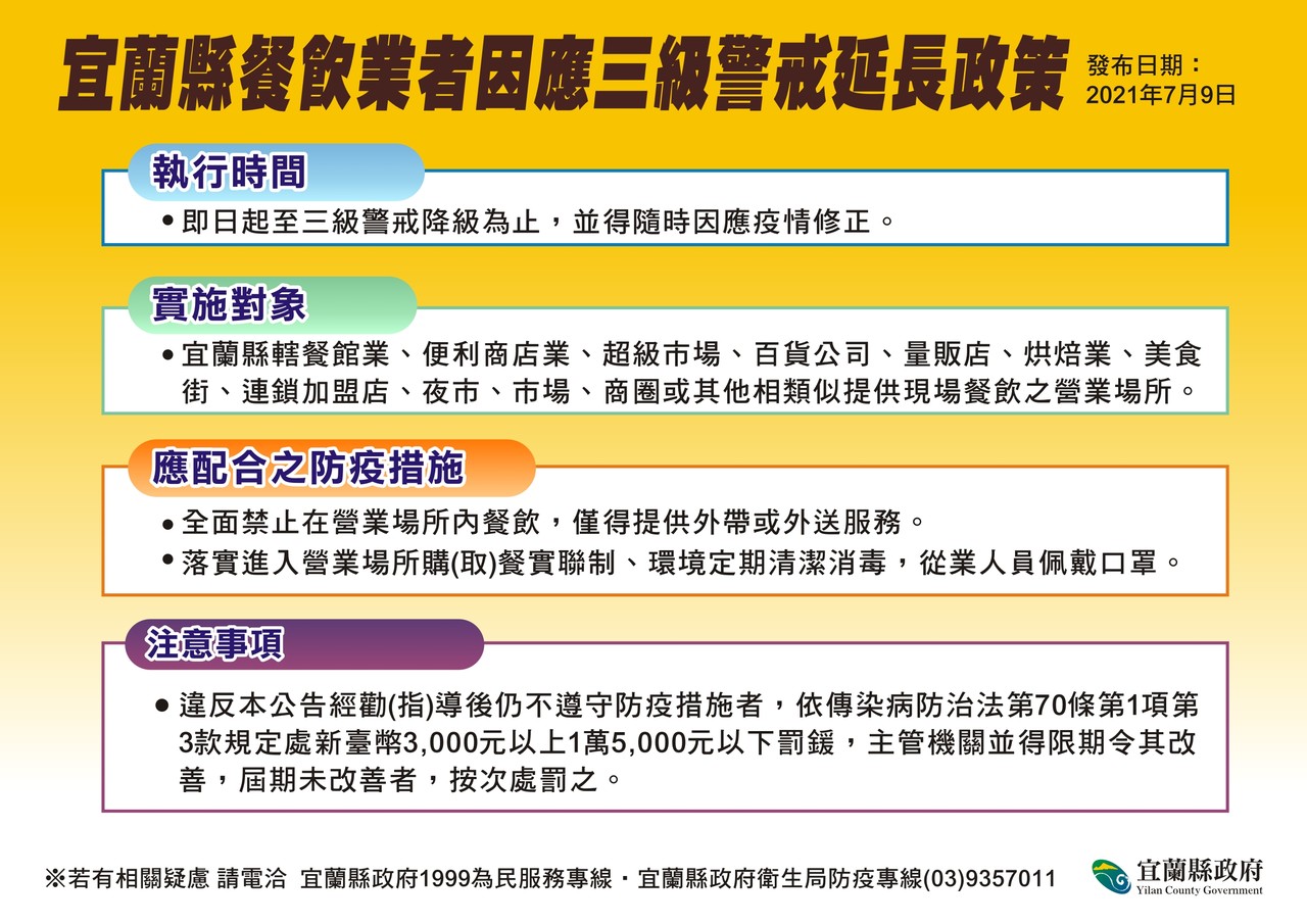 宜蘭縣長林姿妙表示,央流行疫情指揮中心8日延長三級警戒期間,並有條件鬆綁部分場域,也授權地方政府依照防疫需求因時因地調整。宜縣府9日經討論後決定,縣內餐飲業及旅宿業附設餐飲空間等仍禁止內用,一律外帶。