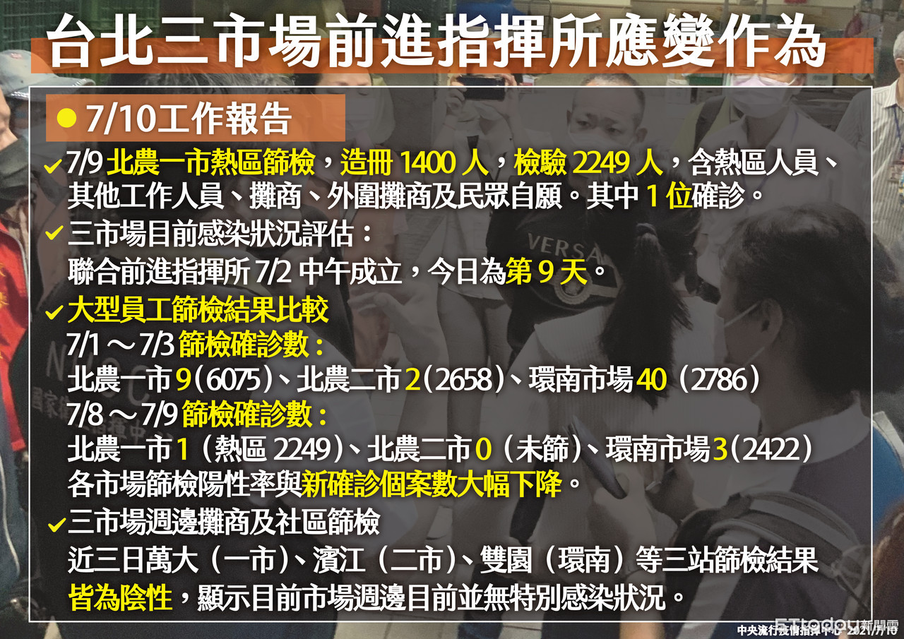 環南市場爆出40人採檢陽性,一度引發緊張,中央流行疫情指揮中心與北市府2日成立聯合前進指揮所,由醫福會執行長王必勝再次擔任指揮官。經過連日的處置,陳時中今公布兩次採檢結果,三市場第一次7/1~7/3採檢,北農一市、二市、含南市場分別有9例、2例、40例確診;第二次7/8~7/9採檢,三市場分別是1例、0例、3例確診,各篩檢站、陽性率大幅下降。