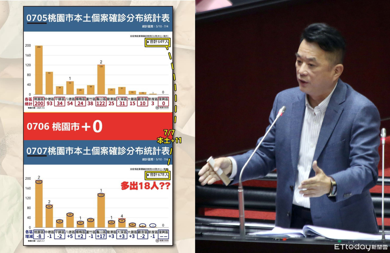 桃園市府6日無新增確診案,全市累計649人染疫,然而桃園選區立委魯明哲10日發現,桃園7日僅新增11人確診,總確診數應該是660例,但桃市府公布的數據則678例,多了18人。他表示,請問多了18人從何而來?何時來的?為何集中在一天偷偷塞進統計數字,桃園市政府有必要說清楚、講明白。