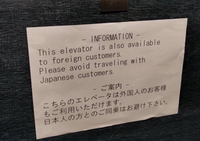 日本共同社報導,位於東京都千代田區的東急赤坂卓越大飯店(Akasaka Excel Hotel Tokyu)被指出在飯店內等升降梯的地方可看到「日本人專用」、「外國人專用」的告示惹議。