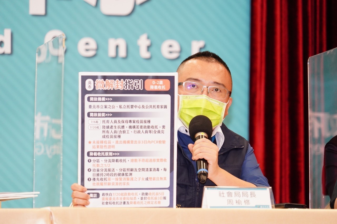 北市社會局長周榆修表示,開放的機構為台北市立案的公、私立托嬰中心及公共托育家園,開放的前提規定包括:台北市從7月6日起邦托育人員及保母專案疫苗接種,7月6日至7月8日總接種率高達95.38%,也就是說95%以上的托育人員都已經完成接種,以14天來看,7月20日起陸續產生抗體,機構若啟動收托,需所有人員(含廚工、行政人員等)全員完成疫苗接種,言下之意,如果托育人員在7月6日接種完畢,可以收托的日期就是7月20日,以此類推,若未接種疫苗或未滿14天,進出機構的人員需出示3日內PCR檢驗結果陰性證明。