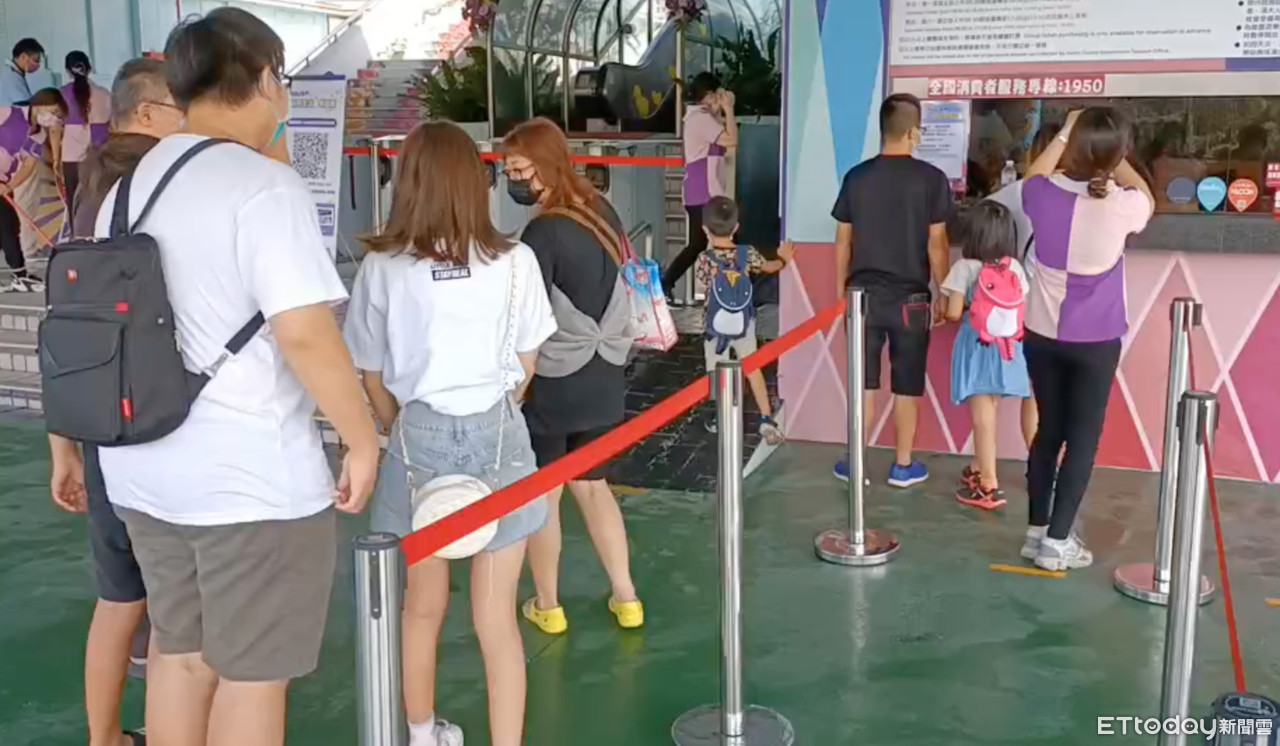 ▲因應微解封,劍湖山世界遊樂園推出「陽光森呼吸」7 月13日至31日購票入園即贈送防護面罩,一早9點開園即有預約遊客提早等候。(圖/記者蔡佩旻翻攝)