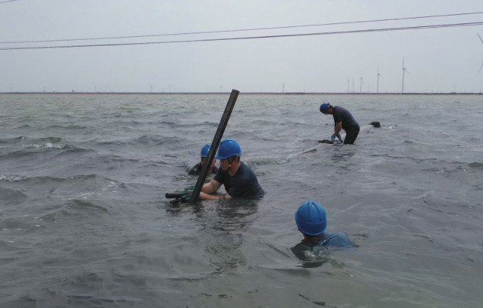 山東濱州昨(12)日遇暴雨或大暴雨天氣,局部地區出現9至12級強風,部分大樹被連根拔起及電線桿倒塌,導致1.2萬戶居民停電。對此,濱州市電力部門緊急派出25支搶修隊約560人,冒雨緊急搶修,其中,在海水鹽池作業的電力工程人員,半身泡在池裡搶修被大風刮斷的電桿及電線,移動時甚至得用「游」的,作業環境十分驚險。