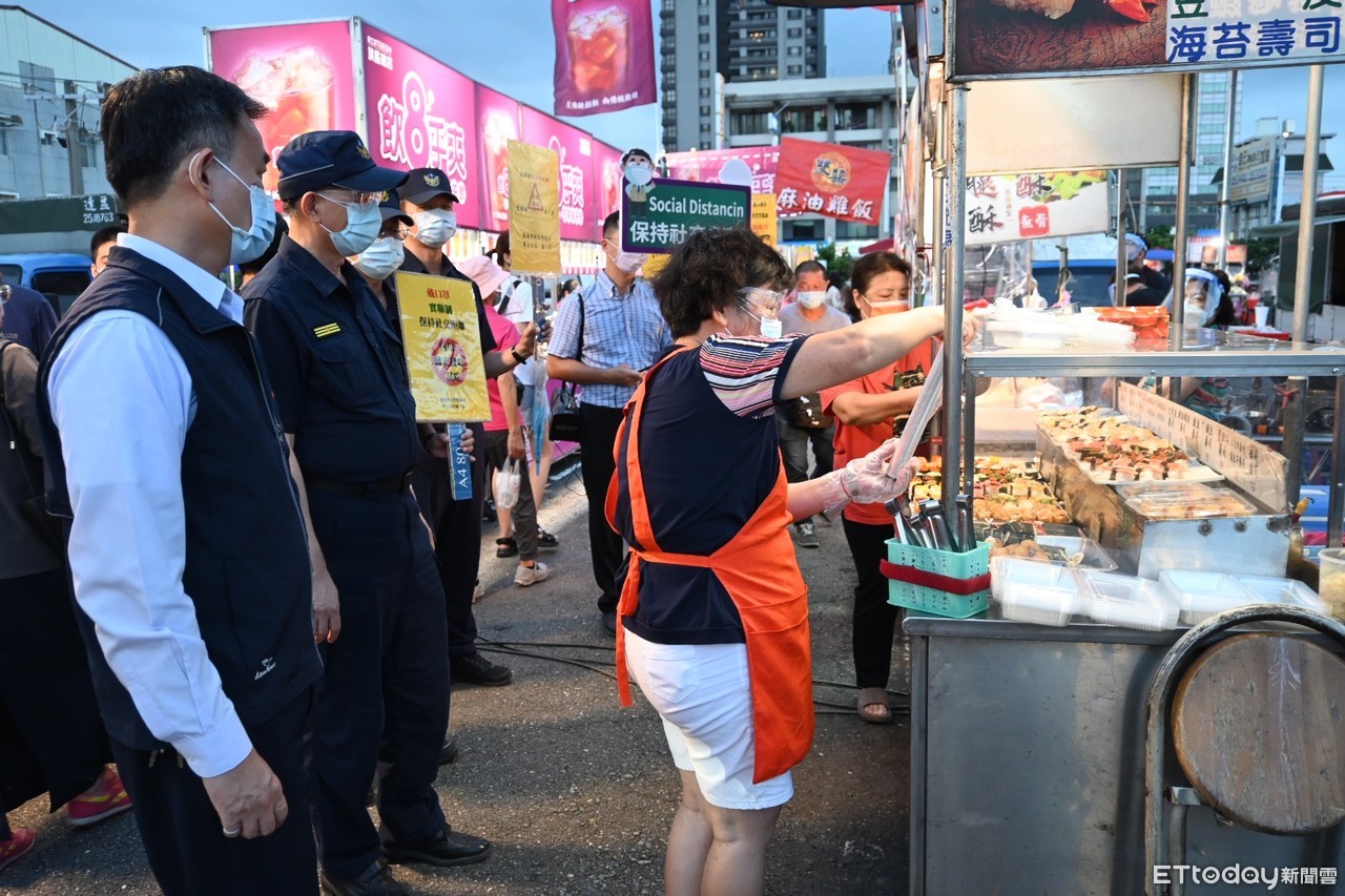 ▲台南市市場處處長陳豪吉,北區區長李皇興及五分局長李名昌等人,率員至新成功夜市實地稽查並加強防疫宣導。(圖/記者林悅翻攝,下同)