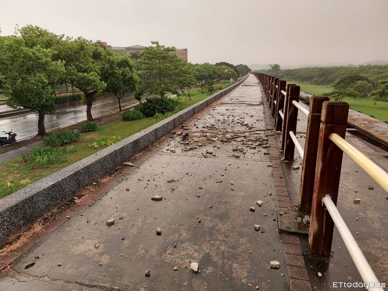 ▲現場水泥地面碎裂,劉男的慢跑鞋也掉落留在原地。(圖/記者黃孟珍翻攝)