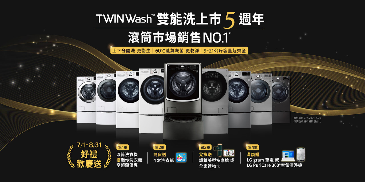 LG TWINWash雙機洗不僅省時省空間,還具備除菌、省水省電、自機清洗且內建Wifi遠端監控及下載軟韌體功能,面板全中文操作直覺簡單,被眾多使用者大讚是洗衣神助手。品牌也深具信心表示,上市以來一直有驚人的成長,足見台灣消費者對分開洗機型的需求,去年2020年銷售量相較第一年已成長10倍,表現有目共睹。今年在台上市5週年,為了感謝消費者力挺,即日起至8/31止,LG推出超甜優惠,活動期間詳洽各大通路TWINWash 五周年購機優惠(註一)。TWINWash買就送洗衣紙、輝葉按摩槍或全家禮物卡,滿額再送LG gram14吋筆電,就是要讓民眾的家居生活因優質家電變得更加便利安心。