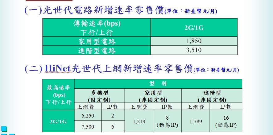 NCC14日通過中華電信陳報新增「2G/1G速率光世代電路及HiNet上網服務資費」,上傳速率高達2G,下載也達1G,是目前國內最高速寬頻上網,但費用也不便宜,電路費+上網費合計月費最低3069元。