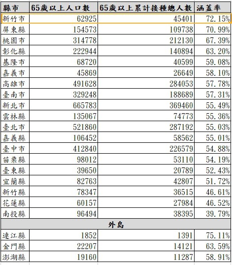 根據中央疫情指揮中心最新統計資料,截至昨(13)日,新竹市65歲以上長輩涵蓋率達72.15%,本島排名第一名,新竹市長林智堅分析,竹市涵蓋率高有兩大因素,首先,從近日報到率屢創新高可發現,越年輕長輩施打意願越高;為服務長輩,市府也設九大疫苗施打站,搭配主動造冊通知,讓長輩免預約、免排隊,也開放不在籍長輩預約造冊、安排施打,才因此能以高效率為長輩服務,提高整體涵蓋率。