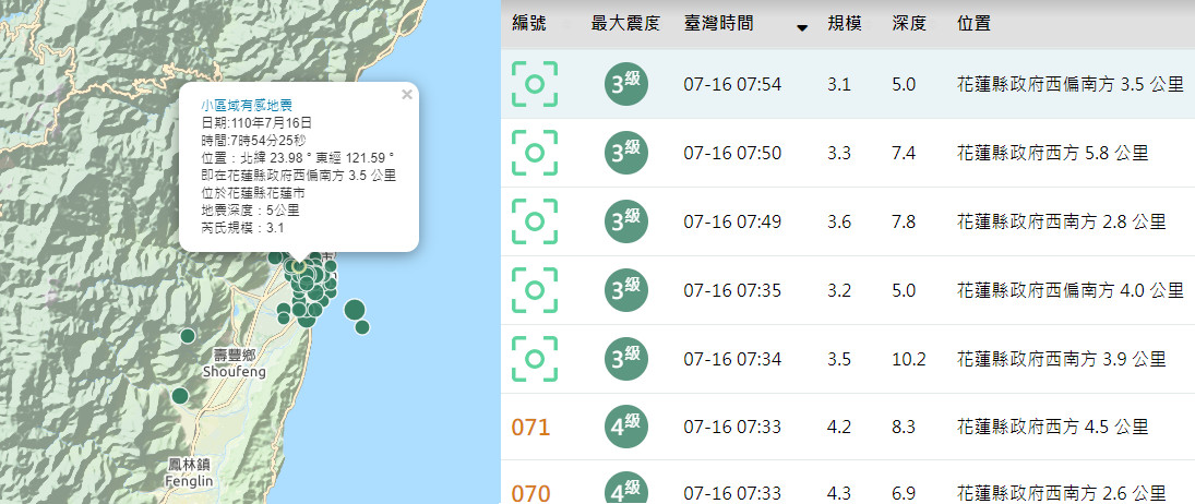 7月16日早上7點05分,花蓮地區發生規模4.7地震,震央在花蓮市、深度7公里,各地最大震度為花蓮4級;南投、宜蘭彰化2級;台中、新竹、苗栗、雲林1級。截至早上9點08分為止,花蓮地區已經發生16次有感地震,其中最大規模為07點29分、07點05分規模4.7最大,其中07點29分的地震連新北市都有感覺。