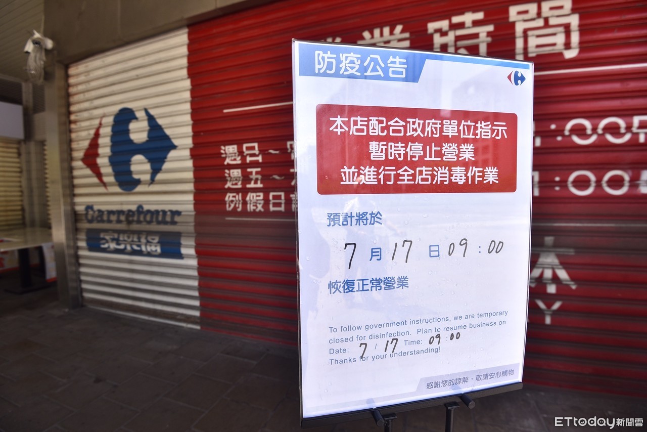 家樂福內湖店今(16)日於門口貼出最新公告,「本店配合政府單位指示,暫時停止營業,並進行全店消毒作業。預計將於7月17日09:00恢復正常營業。」對此,業者證實,昨晚接獲北市衛生局通知「有確診足跡到訪」,並緊急閉店先進行內部清消,雖該確診者停留時間不長,但仍按規定於今日停業1天進行外部大消毒工作,預計明日會恢復正常營業。