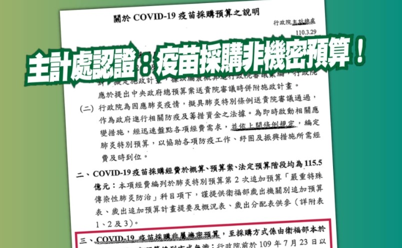 國民黨立委洪孟楷指出我國疫苗採購預算在5、6月內支出暴增37.4億元,質疑錢的流向不明;立委賴士葆則自行推算價格,發現至少有40至50億元不知道花到哪去,但致電審計部審計長陳瑞敏,對方卻說疫苗採購支付是機密。對此,洪孟楷16日貼出今年3月主計處回函,寫著「COVID-19疫苗採購非屬機密預算」。洪表示,既然不是機密預算,民進黨別想隻手遮天。