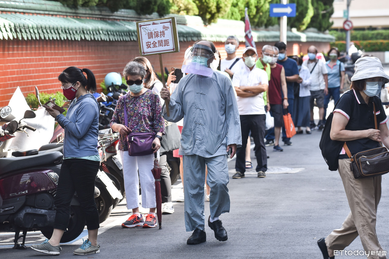 依據照片畫面,許多信眾一早聚集在行天宮外,等待排隊入場,中間要經過實聯制、量體溫、消毒等關卡,入內以後,也要保持社交距離。