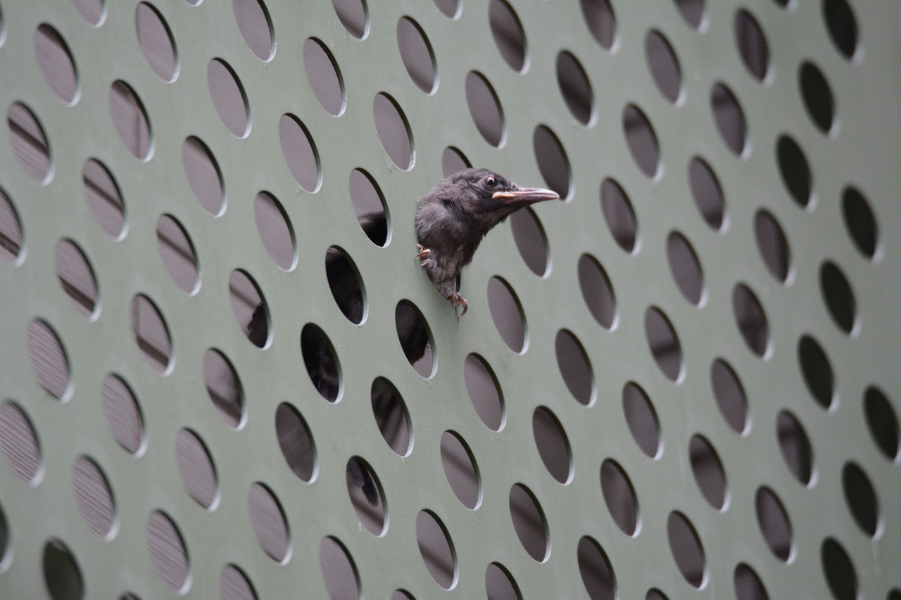 ▲一隻原住民聖鳥「紅嘴黑鵯」的幼鳥誤鑽社區的造景牆小洞,結果身體卡在洞內進退不得。(圖/鳥友王衍智提供,下同)