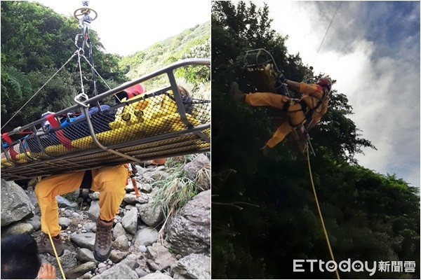 ▲德國男因腳扭傷17日受困新北老鬼瀑布,消防局18日出動直升機協助其脫困送醫。(圖/記者郭世賢翻攝)