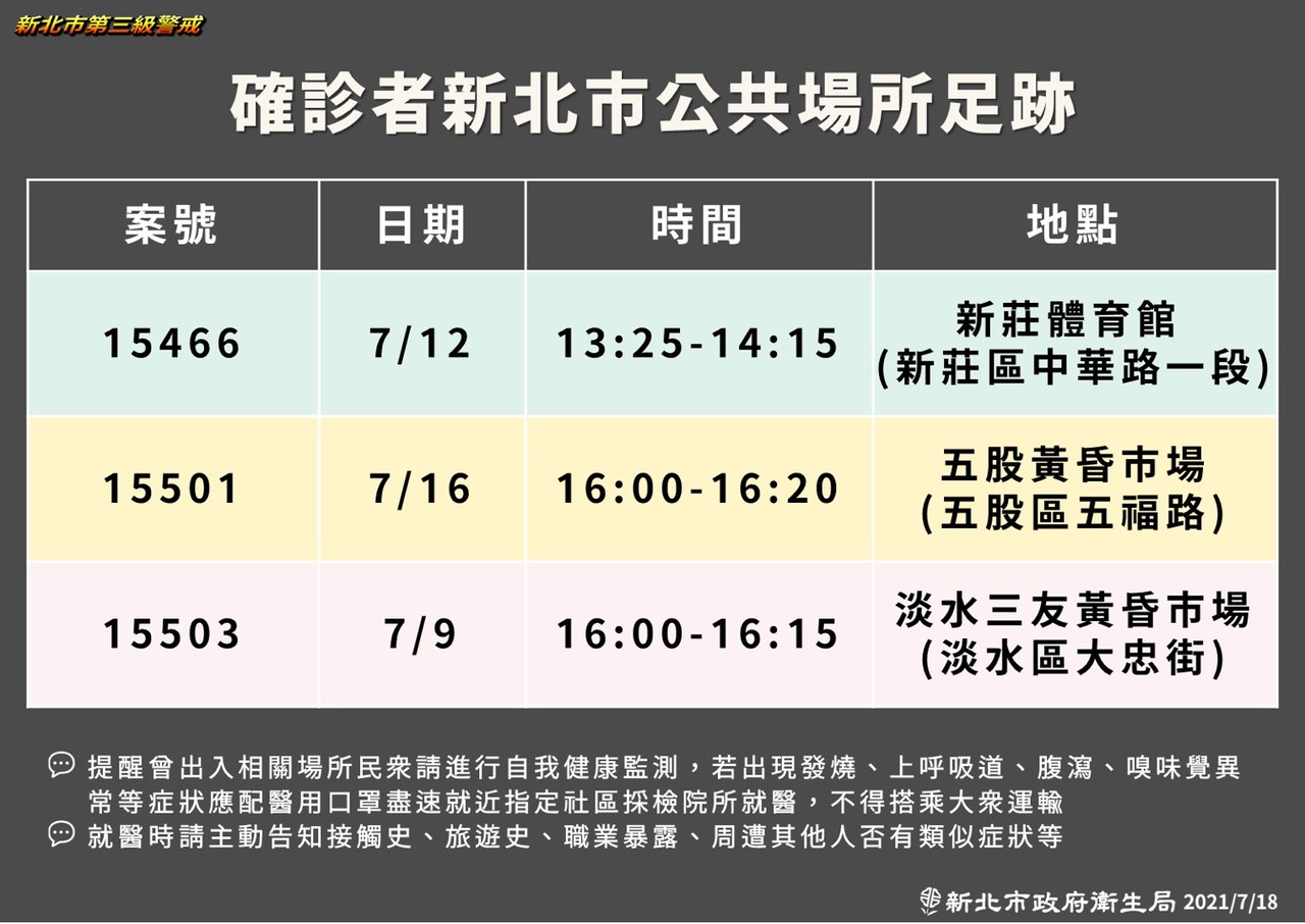 新北市18日增加7個本土病例,分別是板橋3人、中和、淡水、五股、土城各1人。衛生局近一步公布足跡,包括案15466在12日下午停留新莊體育館將近1小時,案15501在16日下午4點赴五股區五福路的黃昏市場,另案15503則是9日下午4點曾赴淡水三友黃昏市場(淡水區大忠街)約15分鐘。
