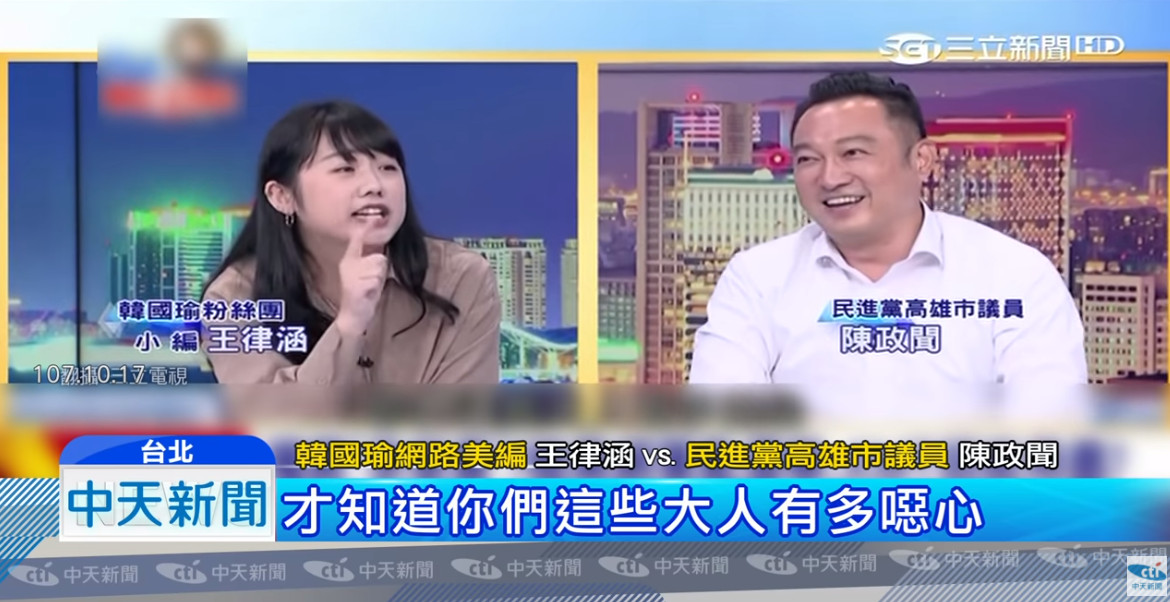 王律涵不甘示弱回嗆,「是你們這些大人才奇怪吧?我們長大之後,才知道你們這些大人有多噁心」,讓陳政聞聽完後只能笑,而一旁的周玉蔻幫忙砲轟,「韓國瑜,韓小弟,你不要帶壞年輕人太可惜了」。