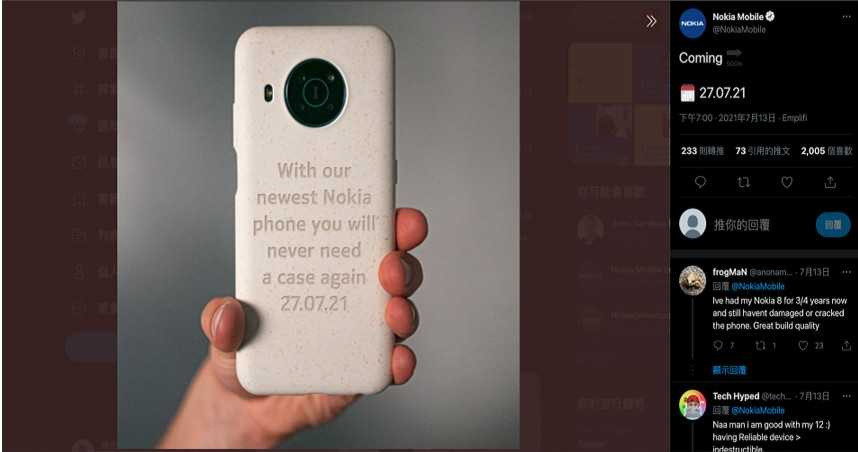 ▲Nokia宣稱即將上市的5G中階手機,不需要手機殼,讓各界相當期待其防護能力。(圖/翻攝自推特)