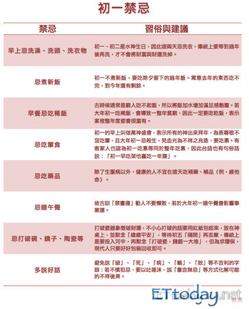 除了親朋好友互相拜年,但嫁出去的女兒千萬不可以在初一回娘家,否則會導致娘家家運衰敗。古人認為,嫁出去的女兒已經算是別人家的媳婦,若在大年初一回娘家,會把娘家吃窮吃垮,因此女兒們最好在初二、初三時回娘家。其實這習俗背後的含意是因為初一這天,婆家必定也有許多客人來拜年,媳婦要幫忙奉茶服侍,因此不可回娘家。