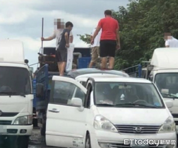 ▲11民眾群聚在車上進行分蝦作業。(圖/記者楊熾興翻攝)