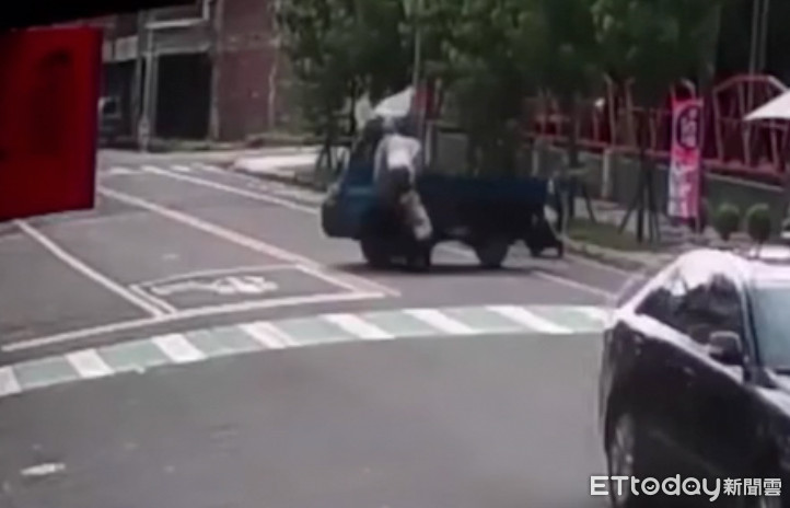 ▲傷者家屬在網路貼出車禍撞擊影片,並指出,該輛貨車肇事後疑似想肇事逃逸,更無視倒在車輪旁的傷者二度移車,所幸有熱心男子狂奔上前拍窗。(圖/記者蔡佩旻翻攝)