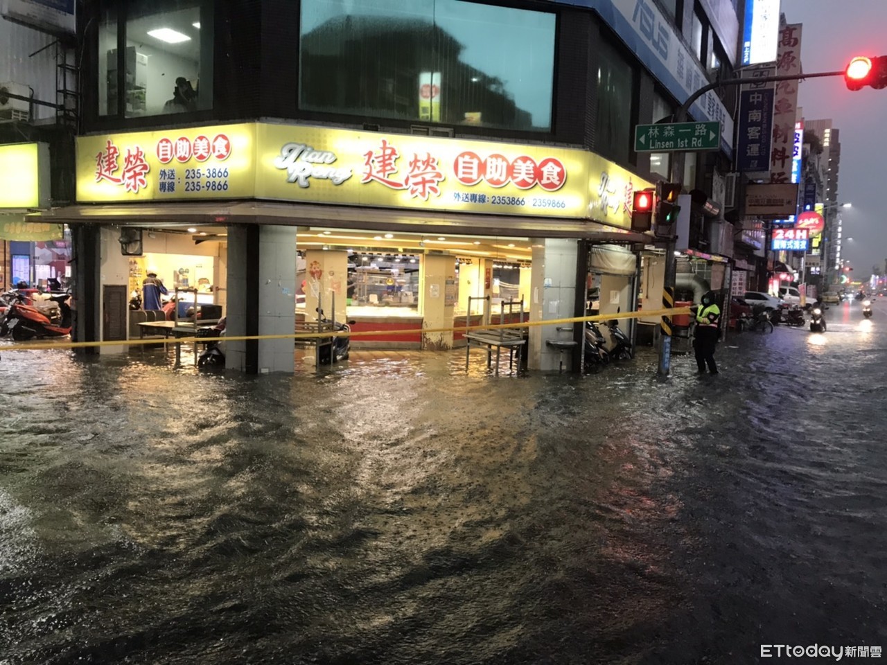新興分局表示,民族、八德路口機車道約半顆輪胎高,目前暫時封閉半個慢車道,並於路口加強交通疏導;八德、林森路口淹水至小腿肚,該路口也已拉起封鎖線,並封閉南北向車道。