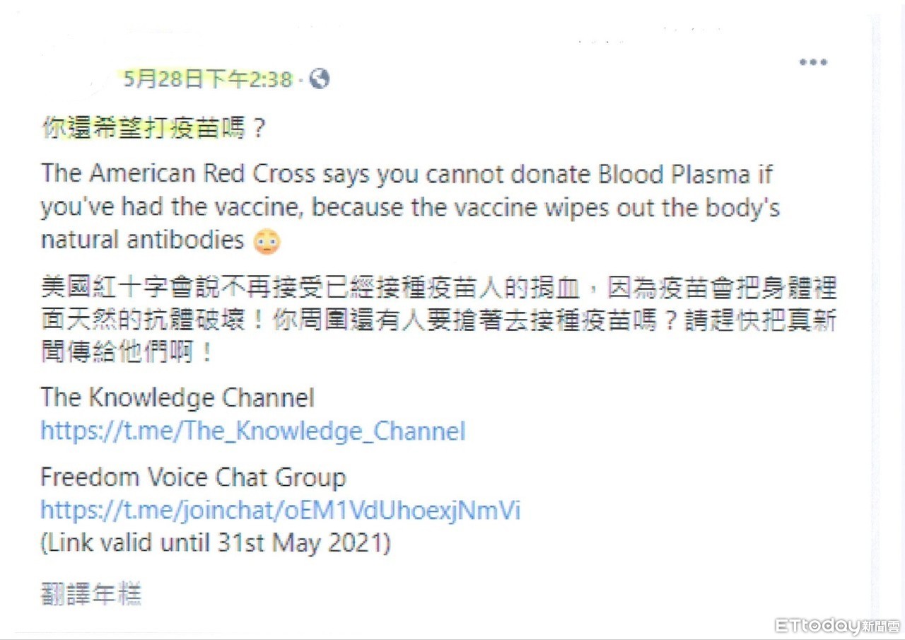 警方表示,75歲的蔡姓男子,在網路上張貼「美國紅十字會說不再接受已經接受疫苗人的捐血,因為疫苗會把身體裡面天然的抗體破壞!你周圍還有人要搶著去接種疫苗嗎?請趕快把真新聞傳給他們啊!」被認定為不實訊息。