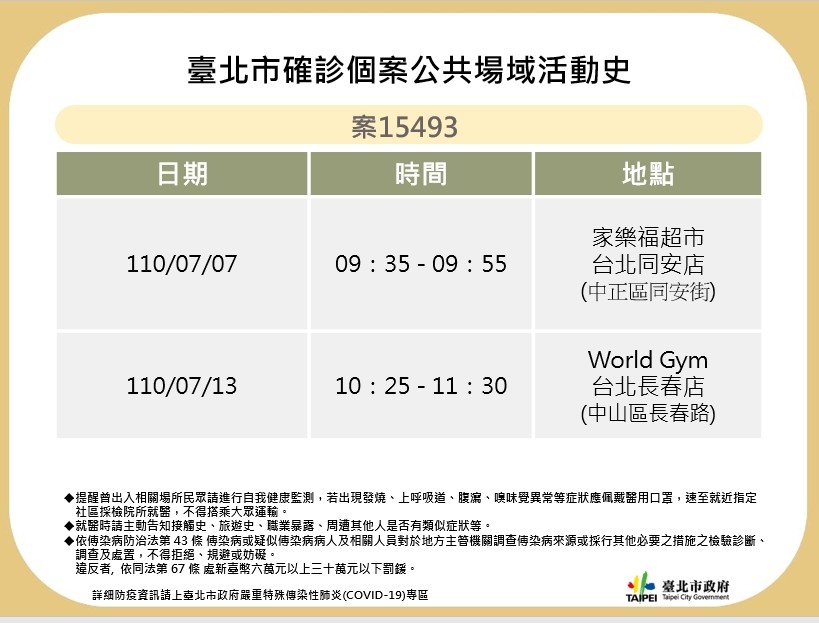 台北市政府衛生局20日公布案15493確診者足跡,該案於17日確診,感染源初判為新竹確診友人來訪,曾於7月7日到過家樂福同安店,20日已安排環境清消及人員自主健康管理;此外該確診者13日也曾到World Gym世界健身俱樂部長春店,該店於19日進行清消作業,20日至22日停業3日。