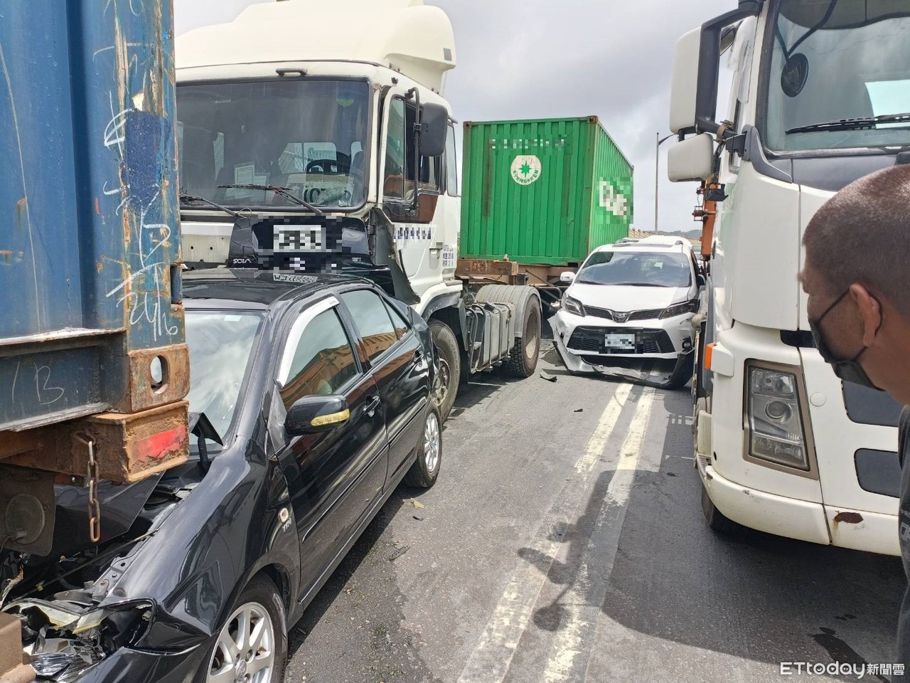 初步調查,現場2輛聯結車、1輛砂石車以及2輛自小客發生追撞事故,目前已先開通內側車道通行,所幸事故並無造成人員傷亡,但詳細事故原因仍需進一步釐清。