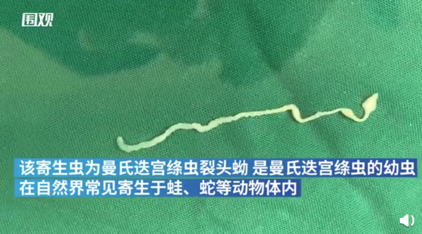 艾男近來因為摔傷就醫治療,才終於被醫生發現病變是由寄生蟲引起,進行手術順利從顱內取出一條10公分的活體寄生蟲。醫生薛亞軍表示,取出的寄生蟲為曼氏裂頭絛蟲的幼蟲,多寄生在蛇、蛙等動物體內,呼籲民眾不要隨意生食,以免不小心病從口入。