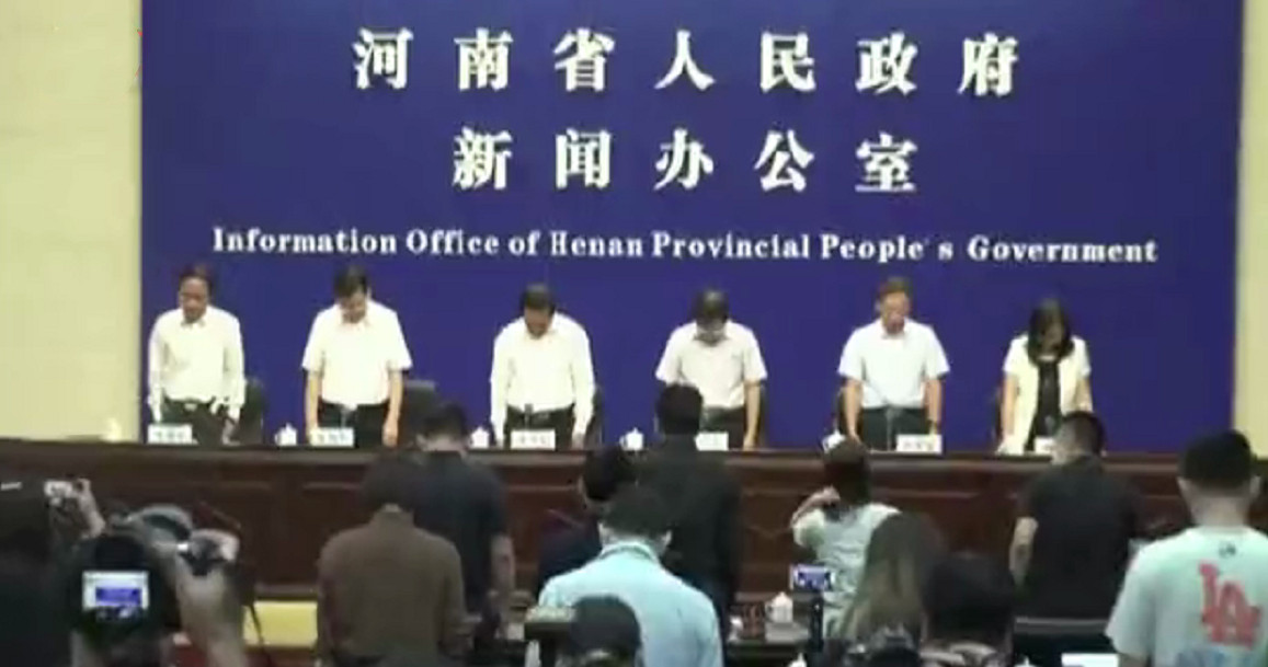 面對特大暴雨造成的嚴峻洪災,大陸河南省21日下午召開「防汛應急新聞發布會」,由省政府說明洪災救援最新情況。據發布會通報,目前災害在全省已造成25死7失聯,在發佈會開始前,主持人先要求全場起立默哀,與會者約低頭默哀數秒後才坐下開始。