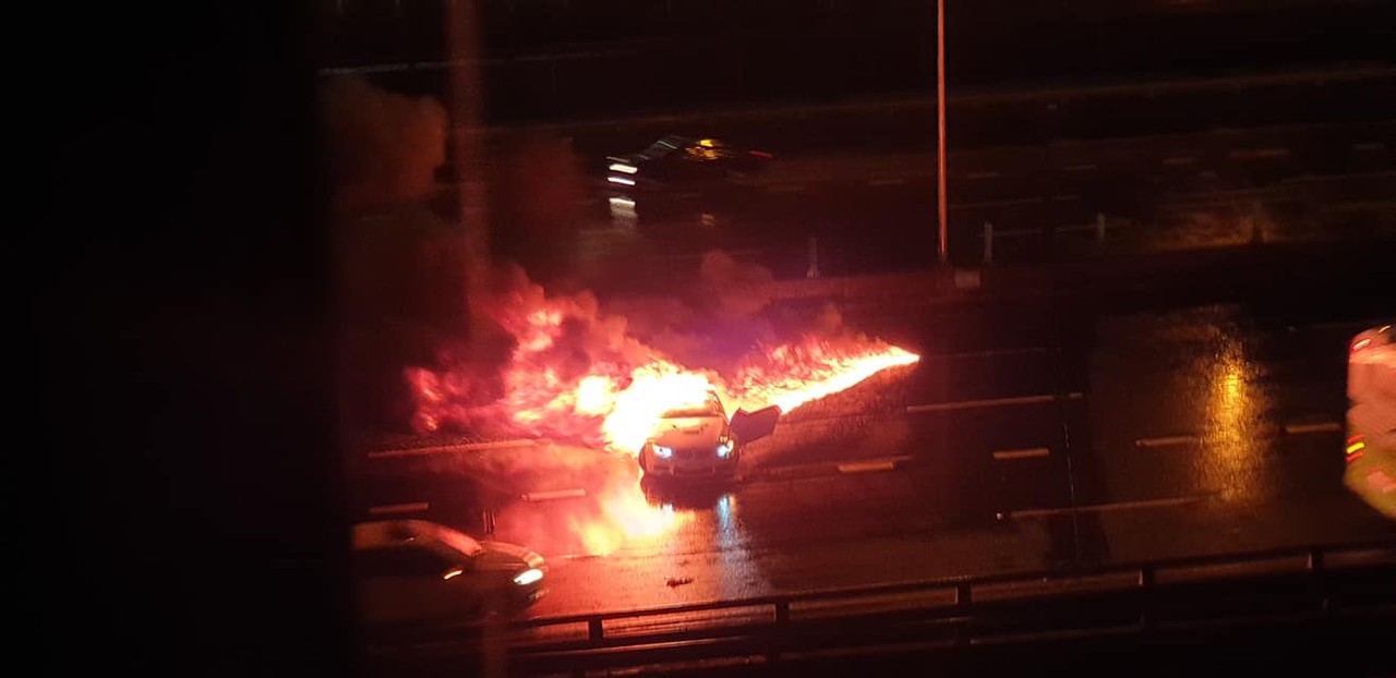 國道1號北上33.3公里處21日晚間11時許發生嚴重車禍事故。一輛白色BMW疑似打滑自撞,最終橫置於路中央起火,火勢非常猛烈,直接將車身吞沒,目前警消已到場進行灌救。