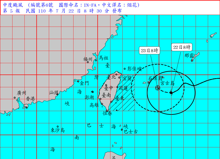 根據中央氣象局最新資料顯示,目前最新中心位置,在北緯23.5度,東經126.1度,即在台北的東南東方約500公里海面上,向西轉西北西緩慢進行,時速從6公里再轉4到7公里,近中心最大風速每秒40公尺(約每小時144公里),相當於13級風,瞬間最大陣風每秒50公尺(約每小時180公里),相當於15級風,7級風暴風半徑200公里,10級風暴風半徑70公里正逐漸對臺灣東北部海面及東南部海面構成威脅。
