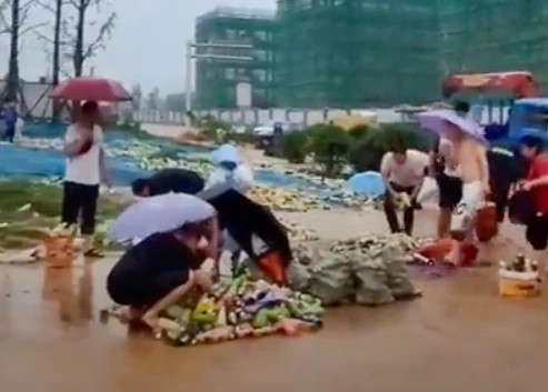 從流傳的影片可以發現,淹水的大街上漂散著大量的寶特瓶飲料,從商標可發現都是康師傅的產品,並有許多民眾拿著雨傘在水中撿拾,還有人興奮大喊,「全民撿飲料啦!」