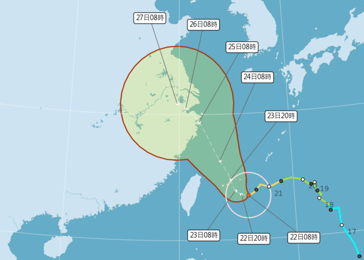 另外,臺灣北部、東半部(含蘭嶼、綠島)、恆春半島及馬祖沿海已有長浪發生;西半部、東北部、東部沿海空曠地區及澎湖、金門、馬祖易有8至10級強陣風,前往海邊活動請特別注意。另颱風外圍環流沉降影響,22日臺東、花蓮及金門地區高溫炎熱,局部地區有36度高溫發生的機率,請注意。