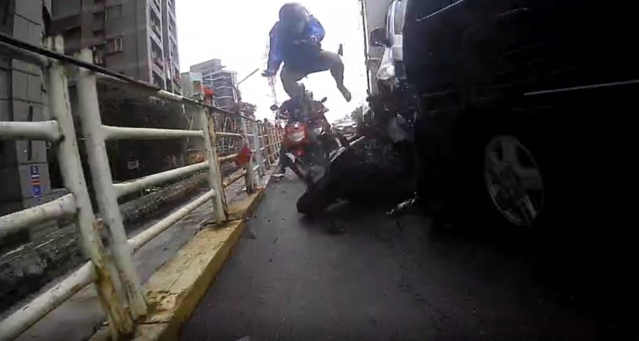 連結雙北的華中橋,在21日下午5時許,1台自小貨車準備前往中和分公司,在下橋時煞車失靈,導致撞上前方停等紅綠燈的外送員,另外也波及1名自小貨車駕駛,前方的後座行車紀錄器也錄下外送員遭撞後當場彈飛,所幸僅擦傷送醫救治。