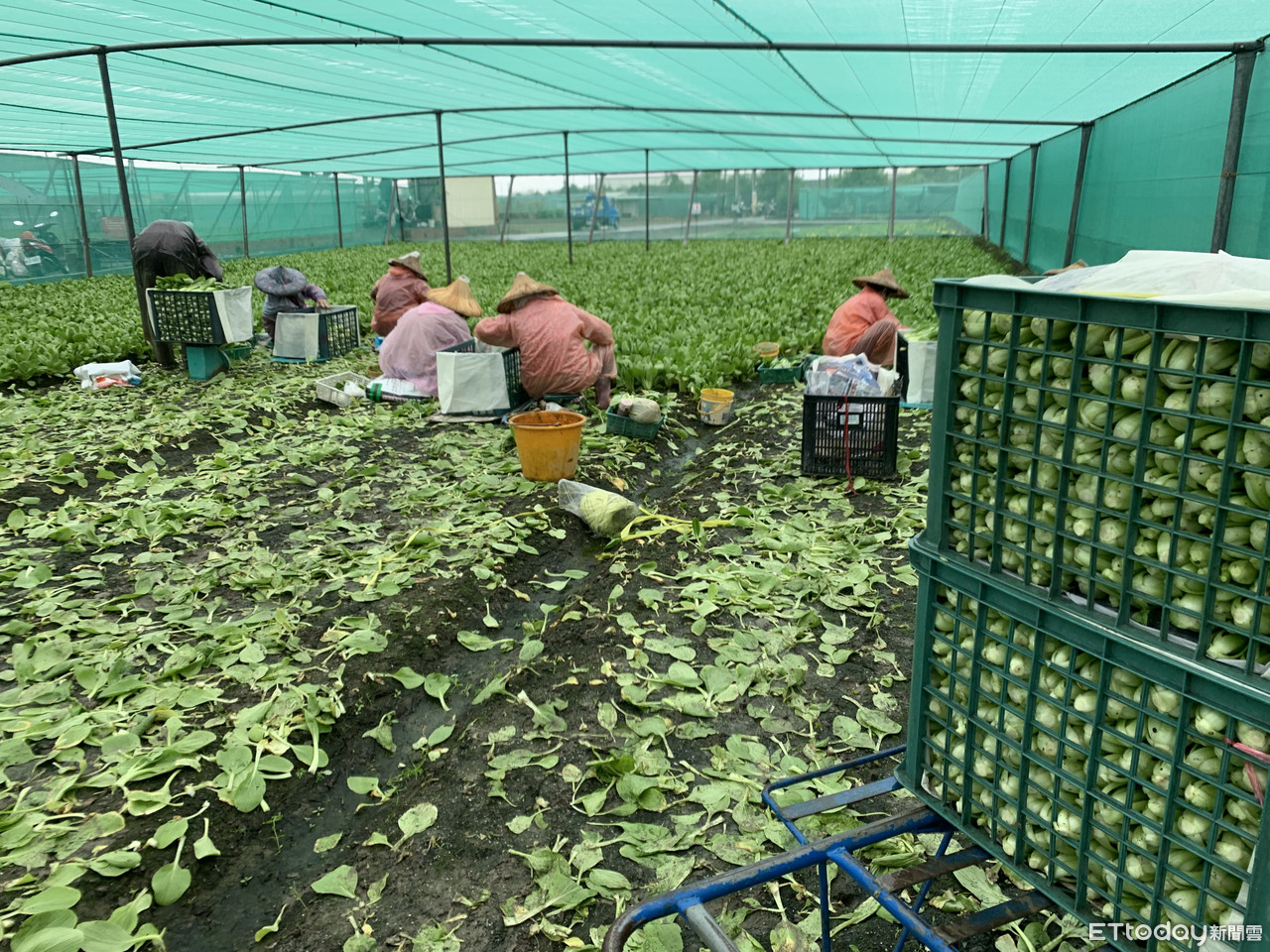 ▲雲林縣凌晨大雨滂沱、雷聲轟隆,農民怕葉菜被雨打爛損害,清晨冒雨到田間加緊採收。(圖/記者蔡佩旻攝)