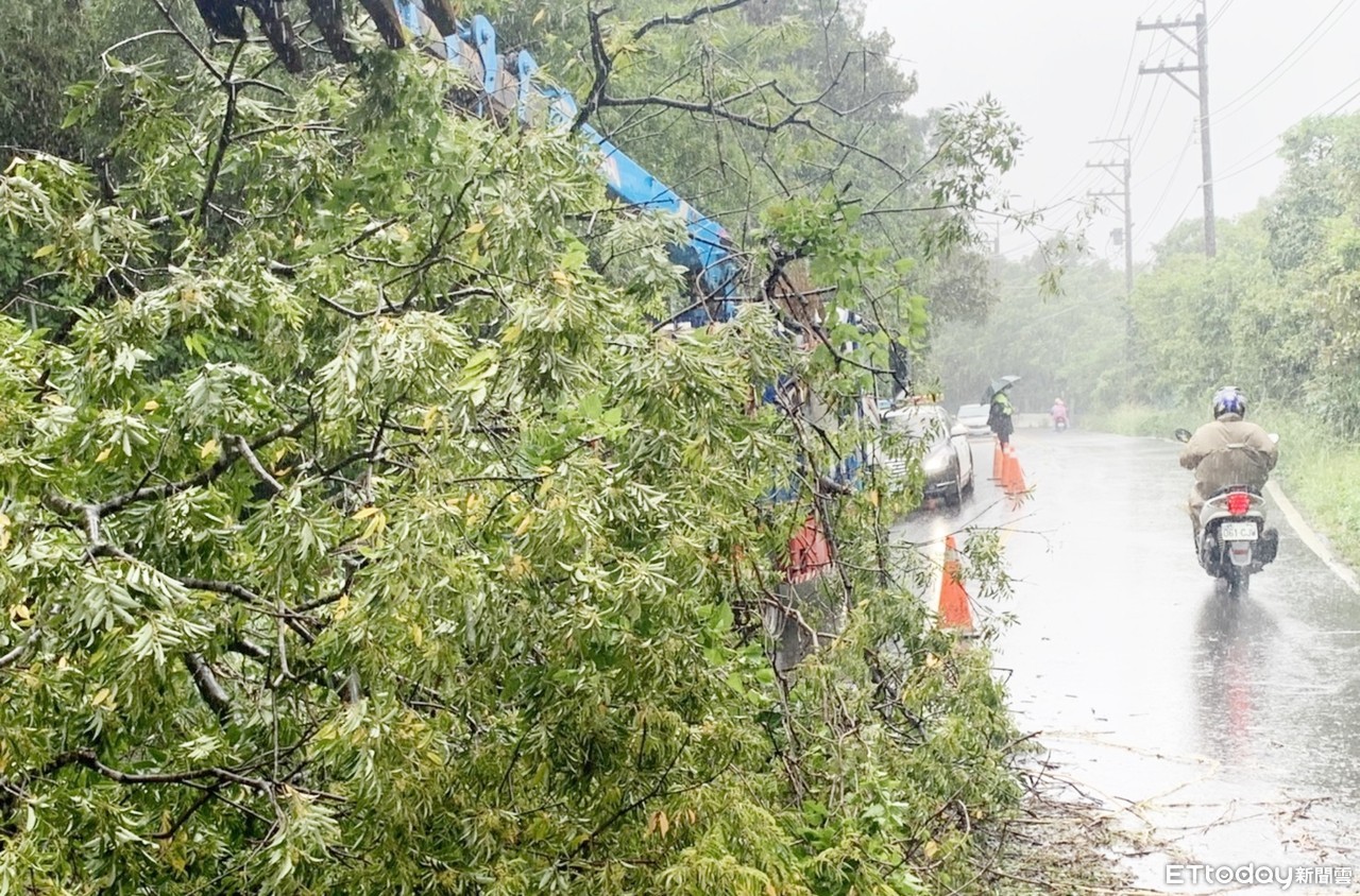 桃園市龍潭區22日凌晨3時許,龍潭區中豐路高平段、龍新路等路段,因大雨強風導致土石崩落,路旁路樹傾斜斷裂橫倒路面,造成路段交通中斷,一度造成路過車輛疑似視線不明發生擦撞車禍,還好並未釀成嚴重傷害,僅造成車輛輕微損壞。龍潭警分局高平派出所接獲報案,警員陳鵬翔與蔡孟霖2人趕赴現場,因颱風來襲前強大豪雨,員警考量深夜視線不佳,立即封鎖龍新路進行交通管制避免行人車輛誤闖造成危險。