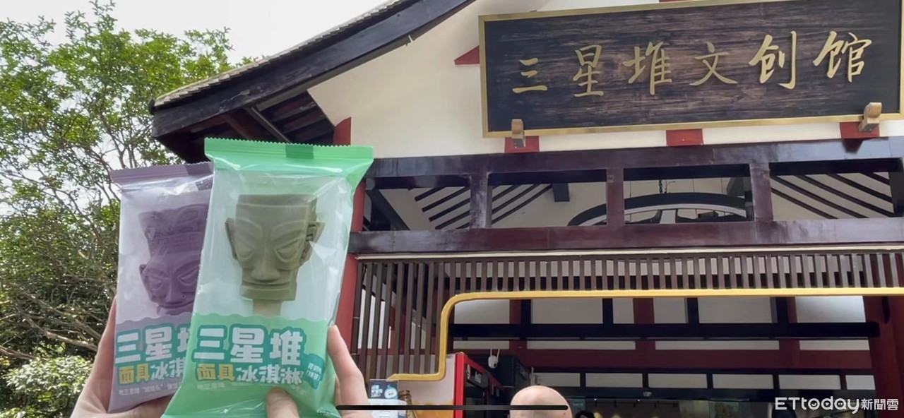 三星堆出土文物,憑借國寶光環和創意營銷,至今產出近千件文創商品。基本款有鑰匙圈、信封、包包、T恤等產品。三星堆還跨界賣冰品,《ETtoday新聞雲》記者實際體驗吃三星堆人偶冰棒,一共有抹茶、巧克力、藍花楹三種口味,口感不甜清爽,一支15元(單位:人民幣同下,換算台幣65元。補貨現場秒殺清空,甚至有遊客跑來問記者團,「你們冰棒哪來的?我搶不到。」