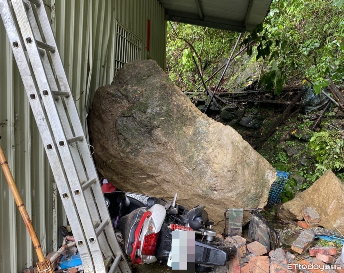 烟花颱風龜速前行,氣象局預估23日晚間至24日上半天最靠近台灣、影響也最大,受到烟花帶來豪雨,新竹尖石、五峰地區從昨日晚間開始下起大雨,縣府也在昨天晚上宣布17所學校停班停課。今天上午尖石鄉嘉樂村一處民宅也因大雨不斷,導致巨石滑落,滾下山突襲民宅外牆,壓毀停在屋外的機車,所幸沒造成人員傷亡。