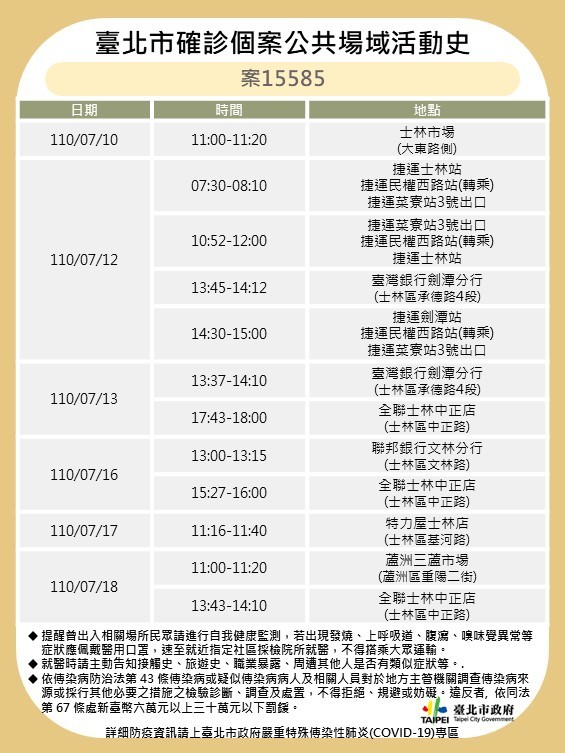 北市衛生局22日也公布案15560足跡,其中7月18日上午11時至11時20分曾去過三蘆市場。