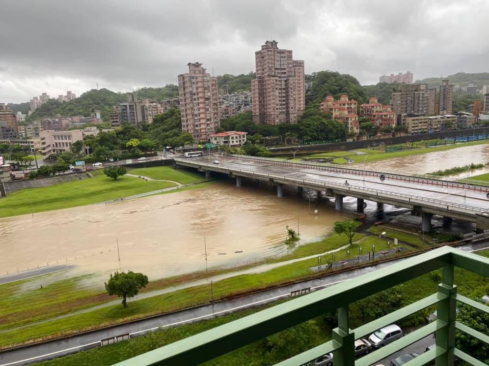 有網友今早在臉書「木柵社團」貼出照」「萬壽橋水滿了」,從照片上可見,橋下的景美溪溪水暴漲,已經淹沒一旁的綠地,就連人行道也遭殃,隨著雨勢越來越猛急,水位也越來越高。