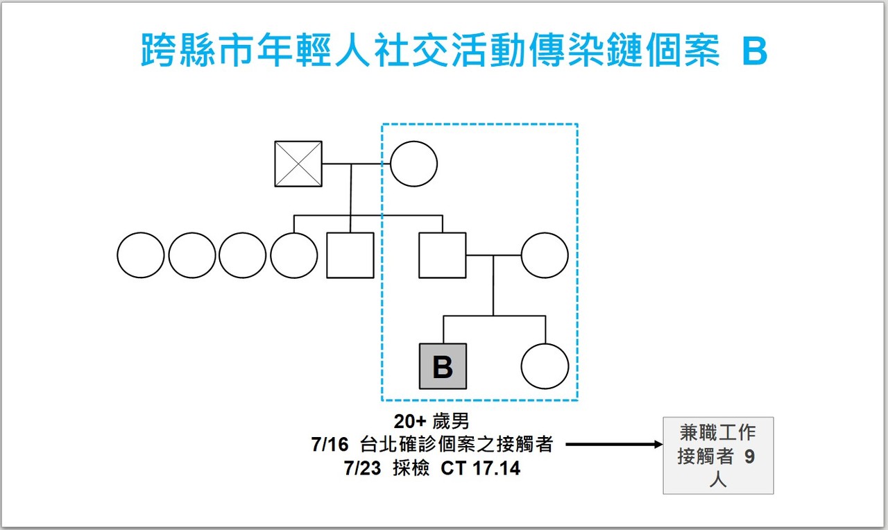 葉彥伯指出,個案B為台北確診個案的接觸者,經採檢過後發現,個案B的Ct值為17.14,而他7/16、7/17曾連續在台北參加3場餐敘,其中7/17的一場餐敘中3名參與者全都確診,3場餐敘接觸者共9人,跟個案A一樣屬於跨縣市年輕人社交活動傳染鏈的一環,跟之前彰化男人幫確診個案雷同。