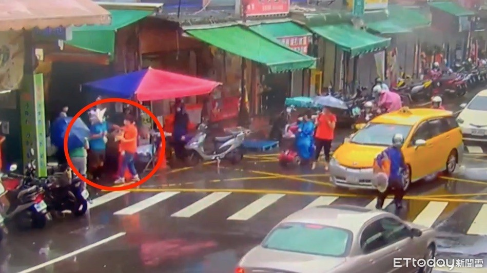 ▲許姓婦人(橘衣)不滿管制人員吳男,持雨傘攻擊他(紅圈處) 。(圖/記者陳以昇翻攝)