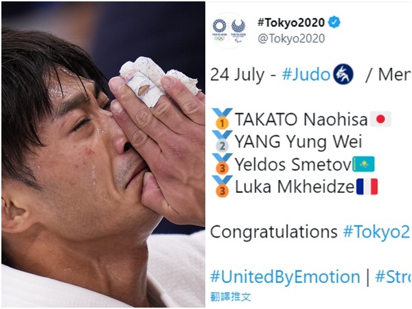 東奧官方24日在推特上發出24日男子柔道60公斤組的結果,但金牌、雙銅牌的選手都有附上國旗,唯獨楊勇緯的名字後方空蕩蕩,甚至連「中華台北」的會旗都沒有。