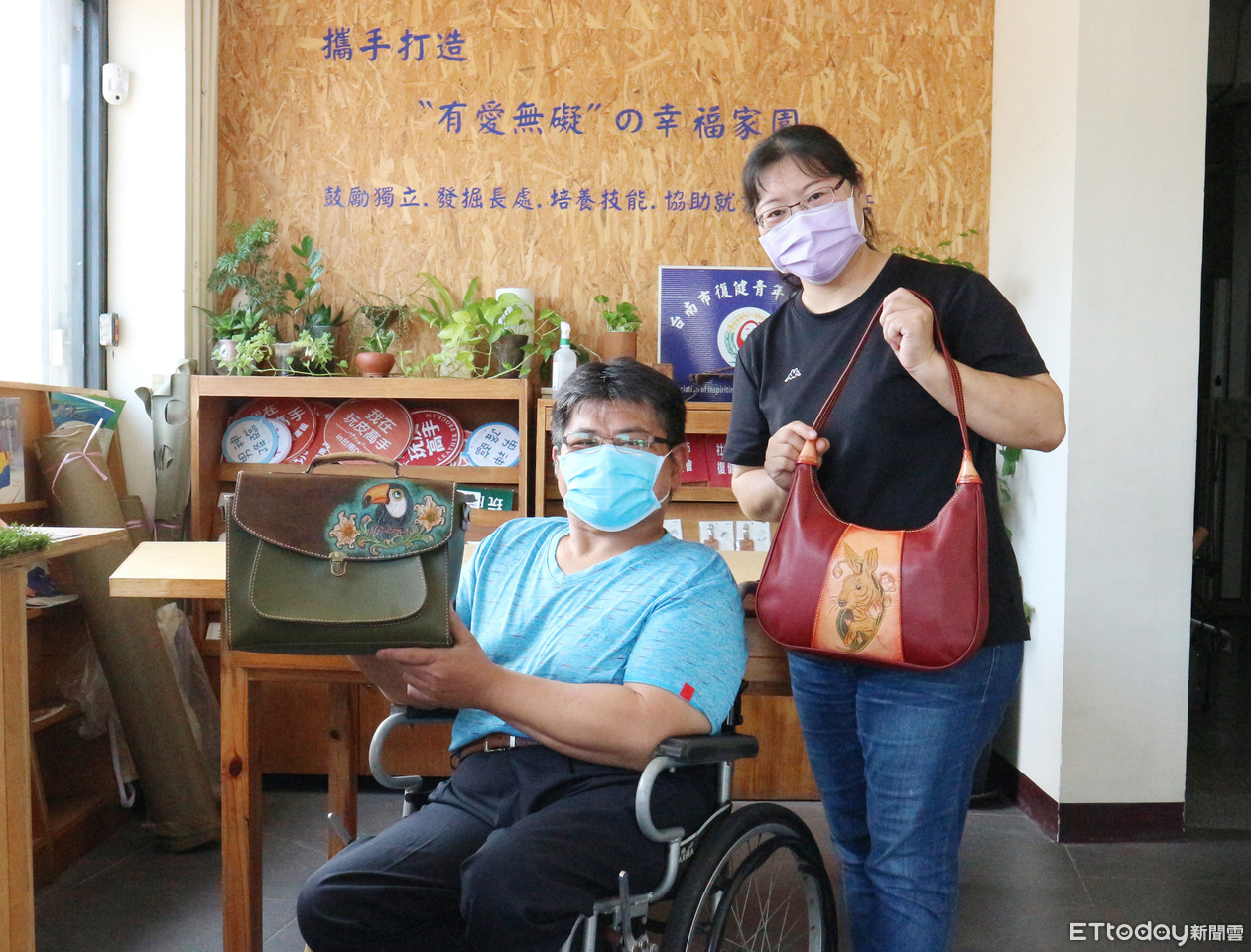 ▲雙腿行動不便的劉永靜(左)透過勞動部多元就業方案進入台南市復健青年勵進會學習皮雕,翻轉人生。(圖/記者林悅翻攝,下同)