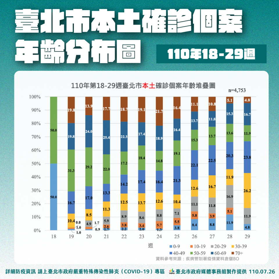 台北市政府26日下午3時30分召開防疫記者會,柯文哲表示,分析北市5、6、7月共3個月的案例,從5月2日至今共有4753例確診,年齡分佈很清楚,最多的是60歲至69歲者,比例高達22%,其次為50歲至59歲為21%,而70歲以上長者則是16%,顯見50歲以上民眾感染比率高達六成,可見「新冠肺炎這個病就是專門攻擊老人。」