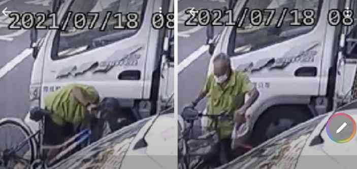 ▲王男經調閱公司監視器影像發現在18日早上約9時許有一名老翁騎乘腳踏車經過時順手將包包撿走。(圖/翻攝自臉書台南爆料公社-台南最大社團)