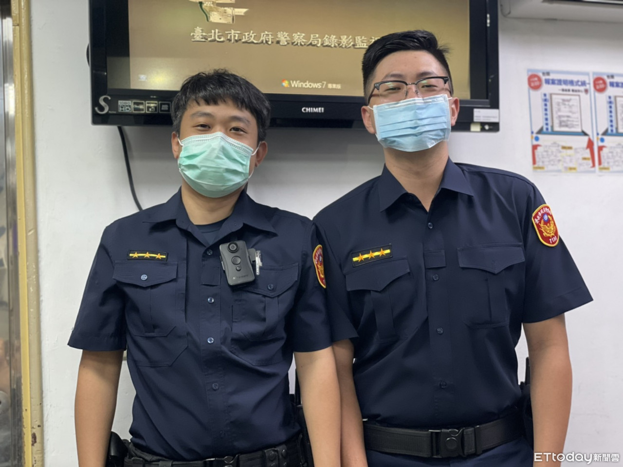 ▲南昌路派出所警員余誠益、吳俊廷熱心向老翁說明阻止歹徒騙匯160萬元新台幣。(圖/記者張君豪翻攝)。