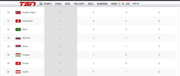 ▲加拿大媒體在官網上的各國奧運獎牌排行榜上,直接以青天白日滿地紅旗代表台灣。(圖/翻攝自TSN)